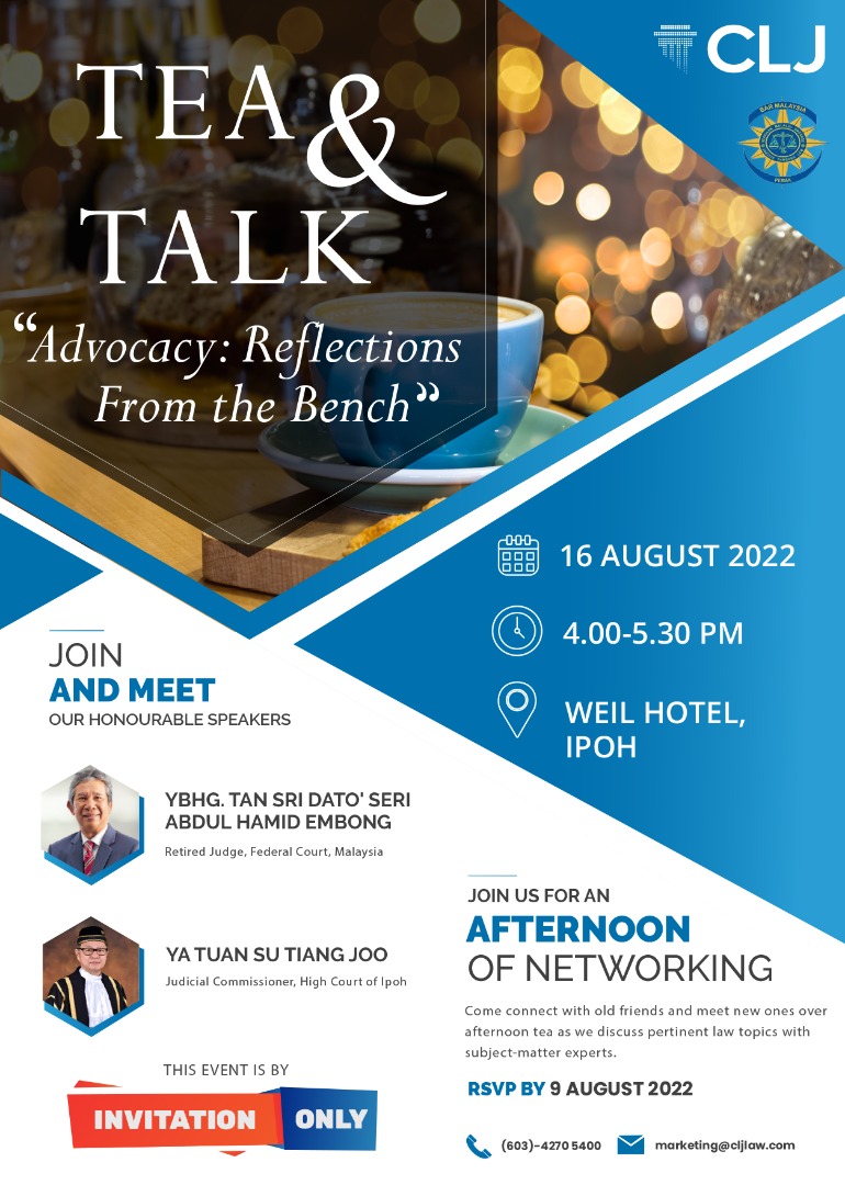 Members are to take note of the above event which is being organised by CLJ in association with the Perak Bar where 2 very distinguished speakers, have been invited to share their views on the topic of “ ADVOCACY: Reflections from the Bench” – retired former Federal Court Judge, Yg Bhg Tan Sri Dato Seri Abdul Hamid bin Embong ( who was previously a Judicial Commissioner and then a High Court Judge in Ipoh) and serving Judicial Commissioner at the Ipoh High Court, YA Su Tiang Joo. Further details are in the brochure which can be viewed here.
