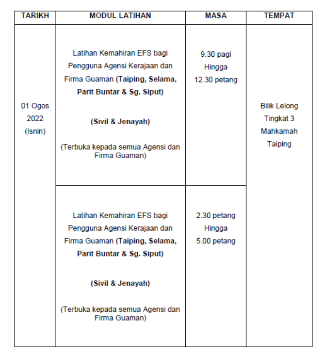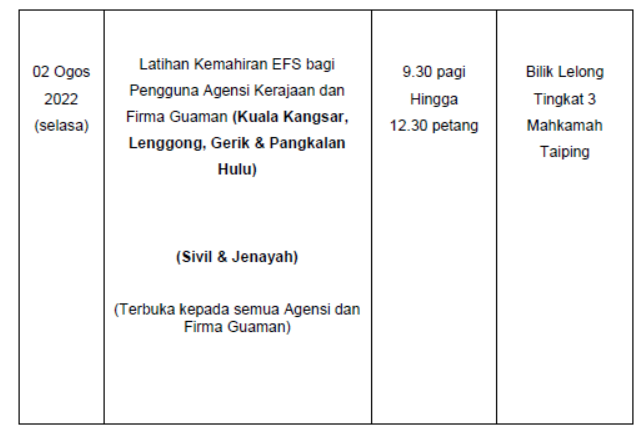 The Director of the e-Court Division of the Federal Court of Malaysia, Mohamad Kamil bin Nizam, has extended to us a notification (by email) dated 25 July 2022, entitled “Jemputan untuk Menghadiri Latihan Sistem E-Kehakiman bagi Tahun 2022 di Kompleks Mahkamah Taiping”, and the schedules for the training sessions for users from Government agencies and law firms that utilise the e-filing system.