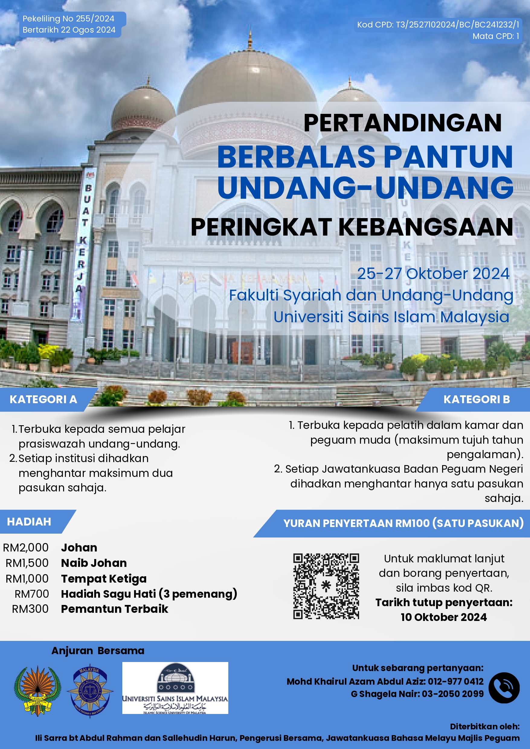 Sukacita ingin memaklumkan bahawa Majlis Peguam Malaysia menganjurkan progam kerjasama dengan Universiti Sains Islam Malaysia dan Dewan Bahasa dan Pustaka bagi Pertandingan Berbalas Pantun Undang-Undang Peringat Kebangsaan tahun 2024 (Pertandingan ini berasaskan undang-undang sahaja). Butiran pertandingan adalah seperti berikut: