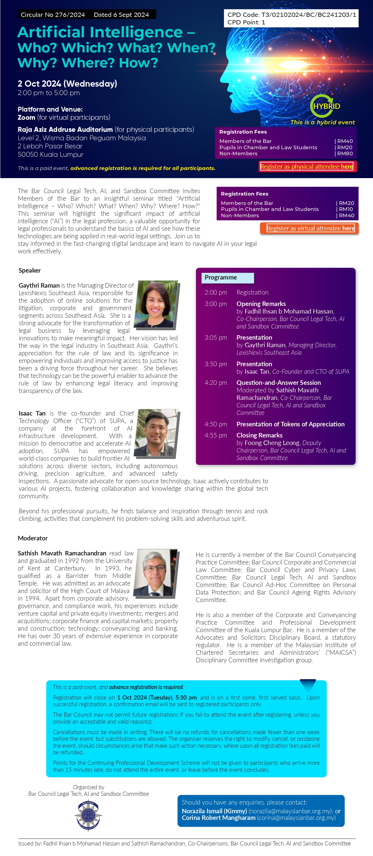 Kindly be informed that the Bar Council Legal Tech, AI and Sandbox Committee is organizing a hybrid seminar on “Artificial Intelligence – Who? Which? What? When? Why? Where? How?” on 02 Oct 2024 (Wednesday).