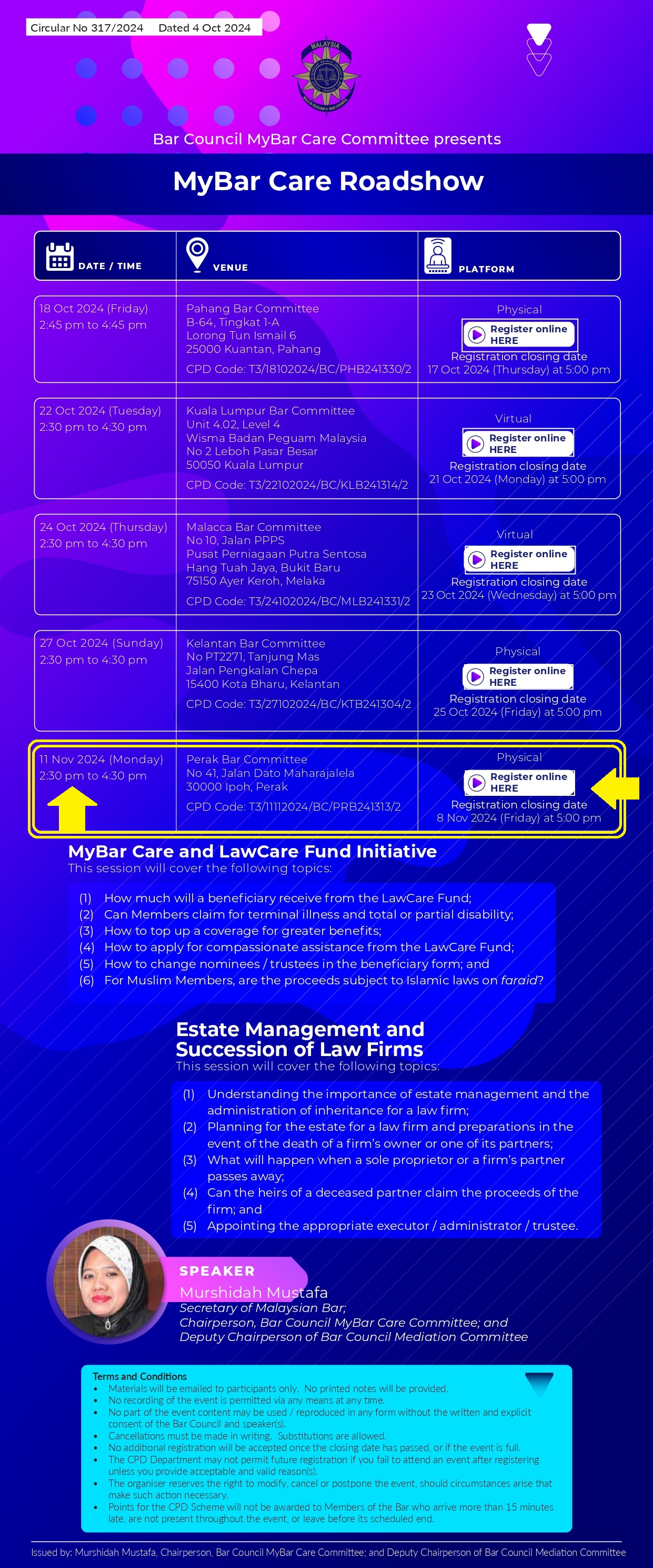 Kindly be informed that the Bar Council Committee on Orang Asli Rights is organising a webinar on Basics for Practitioners : Orang Asli’s Land Rights on 4th October 2024 (Friday). We are also proud to inform members that our own member Mr Amani Williams-Hunt Abdullah will be a speaker in this webinar . We highly recommend members to sign up for this webinar.